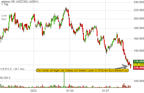 Erstens hat sich Adesso in diesem Jahr halbiert. Die Abwärtsbewegung beschleunigt sich, sodass es auf ein Swing Low hinauslaufen müsste, welches unter 120 Euro entstand.