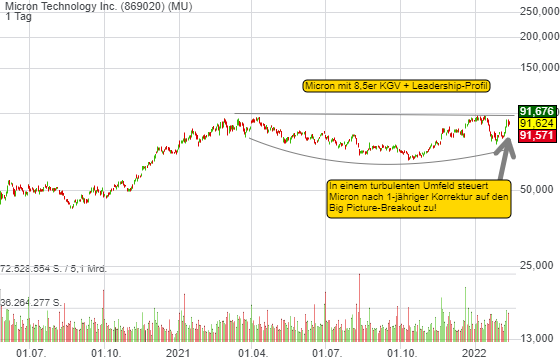 Die Aktie von Micron ist mit einem 6%igen Abstand zum 52-Wochenhoch einer der auffälligsten Tech Stocks in den USA. Damit bahnt sich auch der Big Picture-Breakout aus einer 1-jährigen Korrektur an. Was spricht für die Aktie?