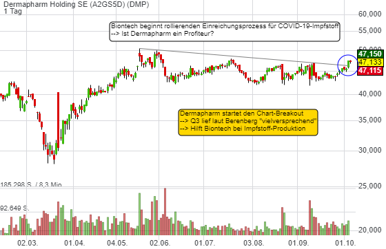 3.) Charttechnisch ist in dieser Woche der Ausbruch über die Widerstandslinie gestartet. Damit hat Dermapharm Platz in Richtung des 52-Wochenhochs, welches nur 6% entfernt ist.