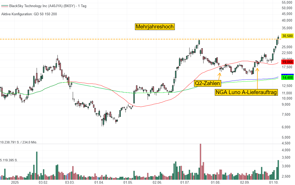 Im Zeitraum zw. 2021 und 2024 konnten die Erlöse um durchschnittlich 44 % p. a. gesteigert werden. Die Umsatzprognose für 2025 musste aufgrund kurzfristiger Schwankungen im US-Haushaltsprozess und der zeitlichen Planung einiger internationalen Verträge von 125 bis 142 Mio. auf 105 bis 130 Mio. USD gesenkt werden. Dennoch sieht CEO Brian O’Toole mit einer gestärkten Bilanz gute Wachstumschancen. Mit einem Ausbruch auf die höchsten Kursniveaus seit dem Jahr 2022 gibt es nun neue Kaufsignale.