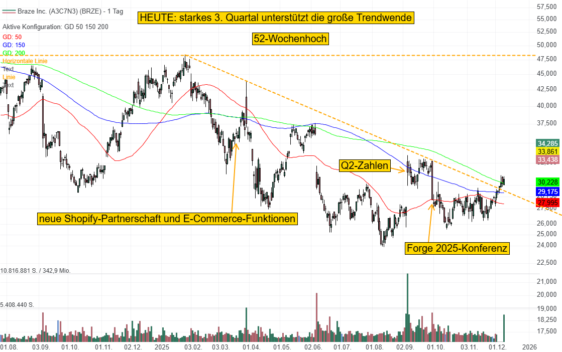 Im 3. Quartal gab es nun mit 14 % auf 2.528 Kunden den stärksten Kundenzuwachs seit drei Jahren. Das organische Umsatzwachstum beschleunigte sich das zweite Quartal in Folge auf 22,3 % und beim Nettogewinn gelang erwartungsgemäß eine Verdreifachung. Für das Fiskaljahr 2025 hob das Management die Umsatzprognose auf 23 % an. Mit einem KUV von 5,2 scheint die Bewertung nicht zu hoch. Der entstehende Pivotal-News-Point liefert ein neues Kaufsignal.