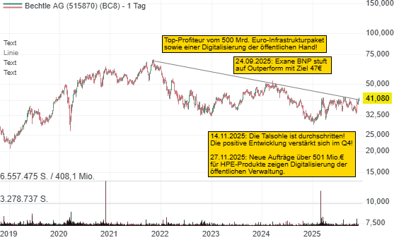 Der Auftrag zeigt, dass die öffentliche Verwaltung ihre Digitalisierung vorantreibt und Bechtle dafür ideal positioniert ist. Zuletzt berichtete das Unternehmen im Conference Call zum 3. Quartal, dass sich eben diese Investitionszurückhaltung der öffentlichen Hand seit auflöst – verstärkt seit September. Im Oktober ging der Trend weiter und wie der Auftrag zeigt auch im November. Ab 2026 könnte das Sondervermögen mit einem 10%igen IT-Bezug einen Zusatzboost geben, was bisher im Aktienkurs nicht eingepreist ist.