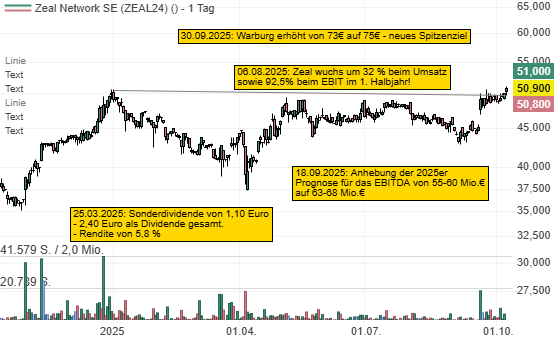 Optimistisch stimmt die Entwicklung von Zeal Network (i) auf charttechnischer und operativer Basis. Der Top-Breakout-Kandidat am deutschen Markt beginnt die 50 Euro-Marke hinter sich zu lassen und ein neues 52-Wochenhoch zu markieren. Es gibt nun erste Indikationen, wie das 3. Quartal verlaufen sein dürfte.