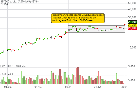 Die Aktien aus dem Anlagetrend der Green Energy Stocks schießen mit dem Beginn des neuen Jahres direkt weiter nach oben. Es wird einer der heißesten Anlagetrends bleiben. BYD als Anbieter von E-Autos und -Bussen bricht auf das 52-Wochenhoch aus.