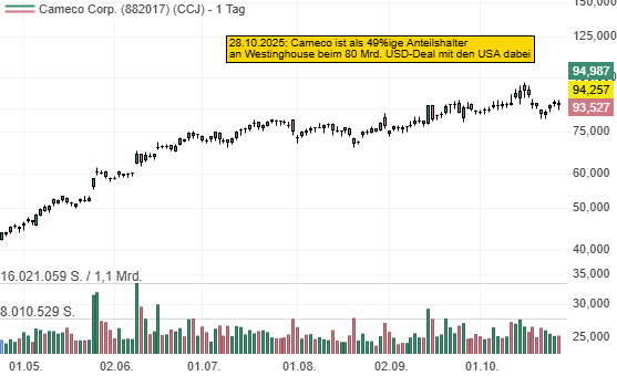 Um den Energiehunger durch das KI-Zeitalter zu stillen, haben Cameco (Anteilhaber an Westinghouse mit 49%), das Infrastrukturunternehmen Brookfield Asset Management (Besitzer von Westinghouse mit 51 %) und die US-Regierung einen Deal bekanntgegeben. Dieser soll den Bau von Atomkraftwerken auf Basis der Westinghouse-Technologie vorantreiben. Im Rahmen dieser Vereinbarung sollen Investitionen von mindestens 80 Mrd. US-Dollar fließen, um neue Reaktoren wie den AP-1000 zu errichten, Genehmigungen und Finanzierung durch die US-Regierung zu sichern sowie die heimische nukleare Wertschöpfungskette wiederzubeleben.