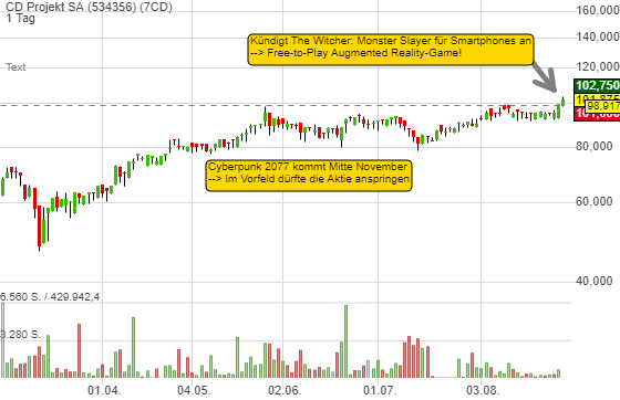 CD Projekt bricht heute auf das 52-Wochenhoch aus. Die neuen Games The Witcher: Monster Slayer und Cyberpunk 2077 wecken Wachstumsphantasie. Die Aktie geht zur Trendfortsetzung über!