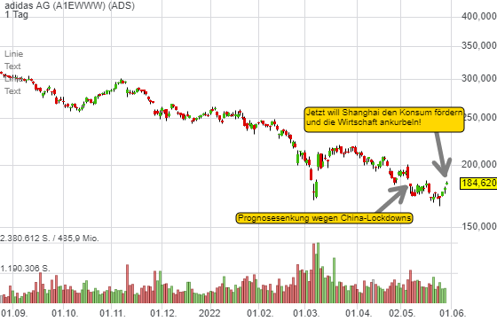 Das Ziel von China ist es mit einem Aufgeben der Null-Covid-Politik und einem neuen Wirtschaftsprogramm wieder das Wachstum voranzubringen. Der Konsum soll auch über die Ausgabe von Verbrauchsgutscheinen einen Impuls erhalten. Ein Top-Profiteur ist Adidas, da man gut 20% der Erlöse in China erzielt. Der Sportartikelhersteller litt im Jahr 2022 unter den Lockdowns. Im ersten Quartal brach der Umsatz in China um 35% ein. Geschlossene Läden, weniger Besucher und Konsum belasteten. Daraufhin wurde auch die Gewinnprognose auf das untere Ende der Range von 1,8-1,9 Mrd. Euro reduziert. Jetzt sollte die Stimmung für die Aktie dank der neuen, geplanten Maßnahmen wechseln. Adidas dürfte ab dem dritten Quartal 2022 erste positive Impulse in China spüren und insbesondere ab 2023 dort deutlich zulegen mit verbesserten Margen. Ein ausgeprägter Rebound könnte starten. Gehen die Konsensschätzungen bis 2024 auf, dann beträgt das KGV lediglich noch 13,5. Das macht die Adidas-Aktie auch im historischen Vergleich sehr moderat bewertet.