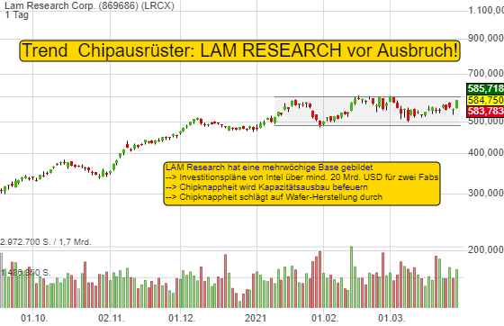 In den USA brechen die Chip-Ausrüster mit als erste Aktien auf neue 52-Wochenhochs aus. LAM Research hat sich für den Breakout in Position gebracht.
