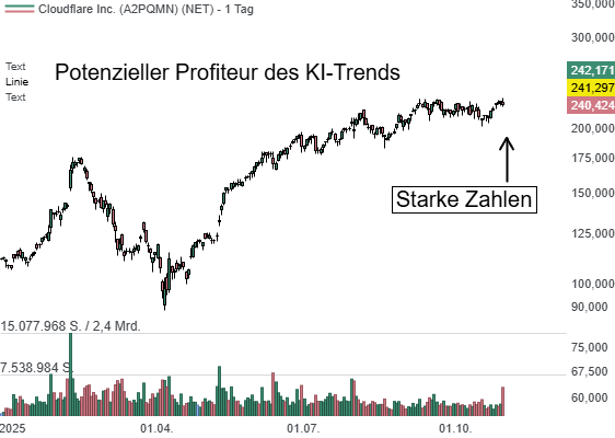 Cloudflare hat im dritten Quartal 2025 die Erwartungen der Wall Street deutlich übertroffen und sich damit erneut als einer der wachstumsstärksten Anbieter im Bereich Cloud-Sicherheit und Netzwerkinfrastruktur präsentiert. Zudem hob Cloudflare seine Jahresprognose für den bereinigten Gewinn an und erwartet nun 0,91 USD pro Aktie. Die positive Dynamik zeigt sich auch in weiteren Kennzahlen: Die sogenannten Billings – ein Frühindikator für künftige Umsätze – legten um 39,6 % auf 624,4 Mio. USD zu und wuchsen damit schneller als der ausgewiesene Umsatz. Das deutet auf anhaltend hohe Nachfrage und starke Liquiditätszuflüsse hin. Der Free-Cashflow erreichte mit einer Marge von 13,3 % einen neuen Höchstwert, was die finanzielle Stabilität des Unternehmens stärkt.