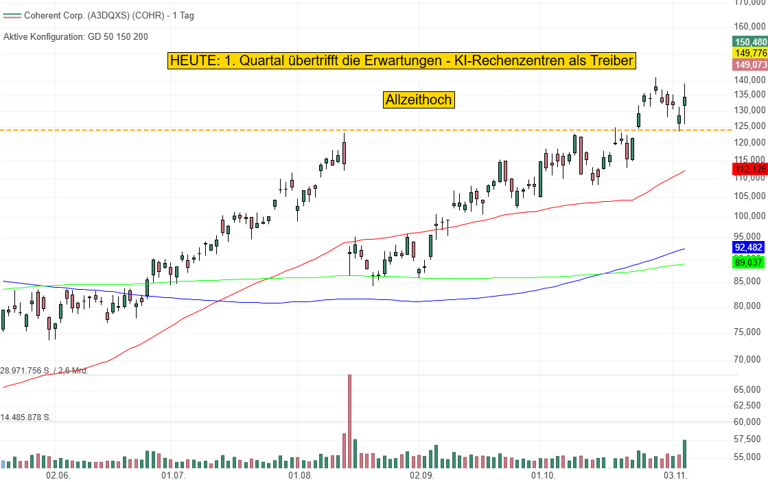 Coherent (COHR) gilt als ein führender Anbieter von optische Technologien und Hochleistungslasern. Geliefert werden optische Komponenten für die Datenübertragung in Rechenzentren sowie auch Präzisionsfertigungslösungen für die Herstellung von Elektrofahrzeugbatterien, Halbleiter, fortschrittliche medizinische Geräte, OLED-Displays und additive Fertigungslösungen. Hinzukommen Sensoren für die Gesundheitsüberwachung, Fahrassistenzsysteme bis hin zu AR/VR-Brillen, die auch in Produkten von Apple zum Einsatz kommen.