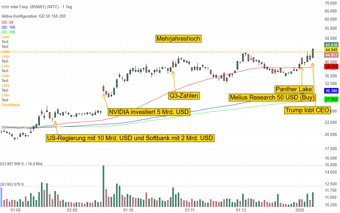 Die Experten von Melius Research stuften die Aktie zudem mit einem Kursziel von 50 USD von "Hold" auf "Buy" und sehen Apple und NVIDIA ab 2028 bzw. 2029 als potenzielle Intel Foundry-Kunden mit 14A, wo das Management zuletzt von "enormen Fortschritten" sprach. Am 23. Januar könnten die Ergebnisse für das 4. Quartal neue Impulse liefern. Mit einem Ausbruch aus der Konsolidierung erhalten Trader neue Kaufsignale.
