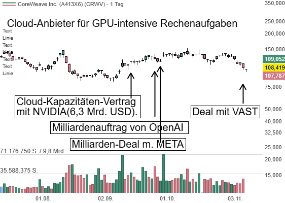 CoreWeave (i) macht mit dem neuen 1.17 Mrd. USD-Vertrag mit VAST Data deutlich, wohin die nächste Optimierungsrunde im KI-Infrastrukturmarkt geht: Weg vom reinen GPU-Zukauf – hin zur Frage, wie effizient die gesamte Rechenstrecke läuft. CoreWeave baut seine Cloud künftig auf dem "AI Operating System" von VAST auf. Damit soll sichergestellt werden, dass Datenströme schneller, stabiler und ohne Umwege in die GPU-Cluster hineinlaufen. Für Anleger ist das spannend, weil es nicht nur ein Technologie-Upgrade ist – sondern eine Verbesserung der Wirtschaftlichkeit: Je weniger Wartezeiten im Cluster, desto mehr zahlbare Rechenstunden können am Markt verkauft werden.