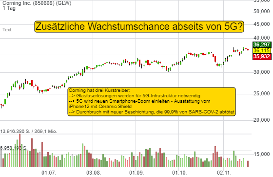 Erstens, der Ausbau der 5G-Infrastruktur wird auch die Nachfrage nach Glasfaserleitungen zum Anschluss der Mobilfunkstandorte bedingen. Corning liefert diese. Gerade ein US-Konjunkturprogramm könnte den Ausbau beschleunigen.