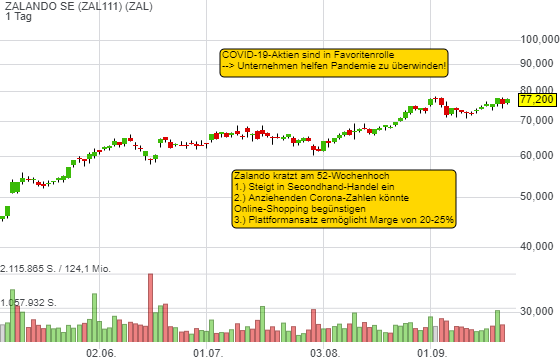 Am deutschen Aktienmarkt ist seit Wochenstart ein Favoritenwechsel zu sehen. COVID-19-Aktien werden akkumuliert. Das sind Unternehmen die helfen, die Pandemie zu bekämpfen und leichter durch sie zu kommen. Dazu gehören Impfstoffhersteller, Anbieter von Schnelltests, eCommerce-Werte sowie Gaming Stocks und Digitalisierer. ZALANDO ist weniger als 1% vom 52-Wochenhoch entfernt und für einen Hit and Run-Trade interessant: