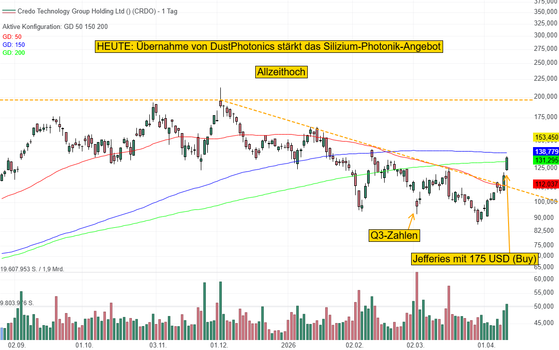 Anfang März verkündete Credo das bisher stärkste Quartal der Firmengeschichte mit einem Rekordnettogewinn und einem Umsatzwachstum von über 200 % im Jahresvergleich. Auch sequenziell betrug das Wachstum im 3. Quartal rund 52 %, das insbesondere von insgesamt fünf Hyperscaler-Kunden getragen wird. Im kommenden Geschäftsjahr 2027 wird erneut ein Umsatzwachstum von über 50 % erwartet. Die Jefferies-Analysten sehen mit einem Kursziel von 175 USD (Buy) einen "Premium-Wachstumswert zu einer deutlich reduzierten Bewertung". ZeroFlap bietet laut den Experten ein jährliches Umsatzpotenzial von über 300 Mio. USD, wobei allein 225 Mio. USD im Jahr 2027 von Oracle stammen könnten.