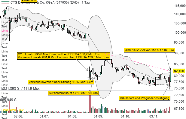 Analysten sehen nach den Zahlen mehrheitlich positive Signale. So hat die UBS die Einschätzung für CTS Eventim am 21. November auf "Buy" mit einer Kurszielanhebung von 115 auf 116 Euro bestätigt. Der Analyst hat zur Erklärung darauf verwiesen, dass das operative Ergebnis im Bereich Live Entertainment nach dem schwachen 2. Quartal eine positive Überraschung gewesen sei. Der Experte hat diesbezüglich seine Schätzungen für den Ticketvermarkter und Konzertveranstalter angehoben.