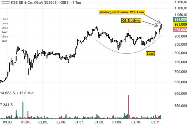 Warburg Research hat am 12. November das Kurzsiel für die Aktie von 1010 Euro auf 1200 Euro angehoben. Da das KGV mit 10 moderat erscheint und man bestens in den beiden langfristigen Trendbereichen Kernenergie und Rechenzentren aufgestellt ist, bleibe ich weiterhin investiert. Mit dem Ausbruch über den Widerstand bei 970 Euro könnte nun die Trendfolge starten. (KSB3)