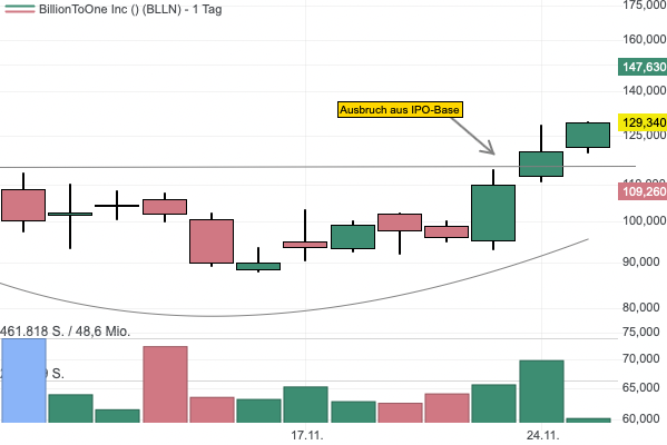 BillionToOne ist erst seit dem 6. November an der Börse, hat sich aber seither schön entwickelt und am 24. November die IPO-Base verlassen. Die Aktie kam zu 60 USD in den Handel, verdoppelte sich dann innerhalb eines Tages, fiel deutlich zurück und zieht nun auf ein neues Allzeithoch, wo man prozyklisch folgen könnte.