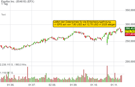 Es wurde in dieser Woche eine neue mittelfristige Prognose kommuniziert. Bis 2025 will man um 8-12% wachsen. Die EBITDA-Marge soll von 33,8% auf 39% zulegen. Der Nettogewinn sollte von 7,60 USD/Aktie auf 12,75 USD/Aktie steigen. Das KGV sinkt auf 21. Das ist nicht teuer für ein Unternehmen mit einem riesigen Datenschatz, der für die Entscheidungsfindung immer relevanter wird. Needham-Analysten sehen in der heutigen Kaufstudie das Kurspotenzial bis 335 USD. Nach dem zweitägigen Rücksetzer müsste die Aktie wieder in der Lage sein ihre langfristige Aufwärtsbewegung fortzusetzen!