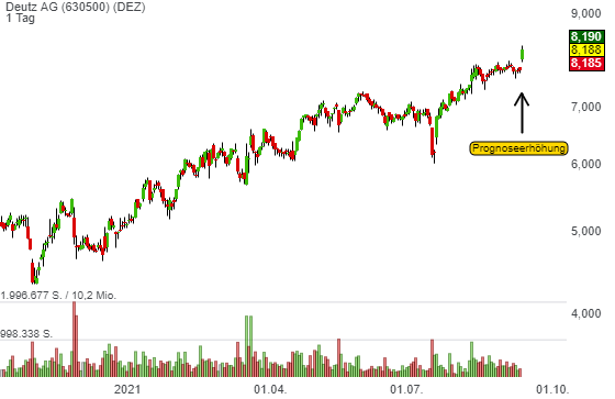 Der frische Impuls kommt von der Prognoseerhöhung, die den Wert auf ein neues Jahreshoch bringt. Demnach rechnet man nun mit einem deutlich höheren Motorenabsatz von 155.000-170.000 statt 140.000-155.000. Der Umsatz wird nun bei 1,6-1,7 Mrd. Euro statt 1,5-1,6 Mrd. Euro (Konsens: 1,58 Mrd. Euro) bei einer operativen Marge von 2-3 % statt 1-2 % (Konsens: leicht über 2 %) erwartet.