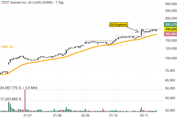 Nach dem Q3-Ergebnis am 30. Oktober, konnte die Aktie auf ein neues Allzeithoch ausbrechen. Aktuell konsolidiert die Aktie in einer engen Range. Mit dem Ausbruch über den Widerstand bei 200 USD entsteht ein neues Long-Signal. (INSM)