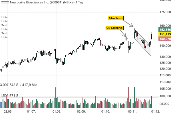 Die Aktie konsolidierte die letzten Tage, konnte aber am 26. November unter erhöhtem Volumen die Konsolidierung verlassen. Die Aktie könnte nun die Trendfortsetzung einleiten. (NBIX)