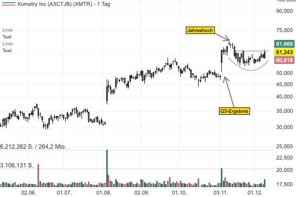 Nach den Q3-Zahlen generierte die Aktie ein Up-Gap, das in den letzten Wochen auskonsolidiert wurde. Am 9. Dezember kam wieder vermehrt Stärke in die Aktie, wobei man hier nun darauf setzen kann, dass die Aktie zeitnah Richtung 75 USD läuft. (XMTR)