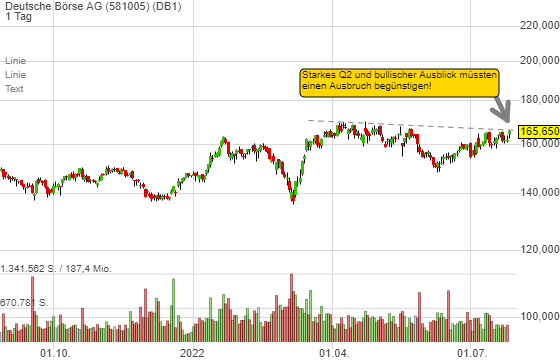 Das Marktumfeld ist für die Deutsche Börse optimal. Der Konzern profitiert von zyklischen Faktoren, wie einem Volumenanstieg bei Index- und Zinsderivaten, Gasprodukten sowie dem Anstieg der Nettozinserträge aus dem Bankgeschäft. Das strukturelle Wachstum resultierte hingegen aus der Gewinnung neuer Kunden im Bereich ESG sowie mehr Nachfrage nach Market-Intelligence-Produkten bei Data & Analytics. Vor diesem Hintergrund toppte man gestern Abend mit einem EPS von 1,86 Euro die Erwartungen von 1,79 Euro im zweiten Quartal. Entsprechend geht man davon aus das Ziel eines EBITDA von 2,2 Mrd. Euro deutlich zu übertreffen.