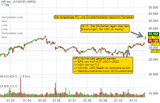 HP Inc will im Jahr 2022 einen ersten Gewinnsprung von 3,79 USD/Aktie auf 4,07-4,27 USD/Aktie realisieren. Eine stärkere Nachfrage nach PCs, Servern sowie 3D-Druckern kann zu einer positiven Überraschung beitragen. Zudem will HP Inc auch Übernahmen tätigen, um das Wachstum anzuschieben. Die Story ist intakt. HP will beim Ertrag zulegen und die Aktie startet zu einem bedeutsamen Chart-Breakout!