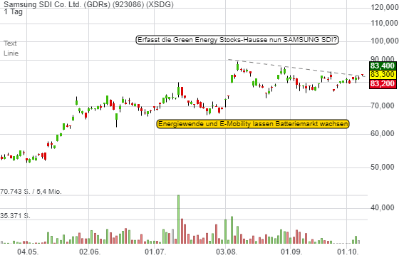 Die Green Energy Stocks sind in einer gewaltigen Hausse. Über die nächsten Dekaden findet die Transformation zu einem CO2-ärmeren Energiesystem statt. In den letzten Tagen intensiviert sich die Hausse, weil Joe Biden mit teilweise 16 Prozentpunkten vor Trump liegt. Es wird voll auf einen Wahlsieg Bidens gesetzt, der die Energiewirtschaft bis 2035 kohlenstofffrei machen möchte und 2 Bio. USD an Investitionen in den Klimaschutz über vier Jahre anstrebt. Startet nun Samsung SDI?