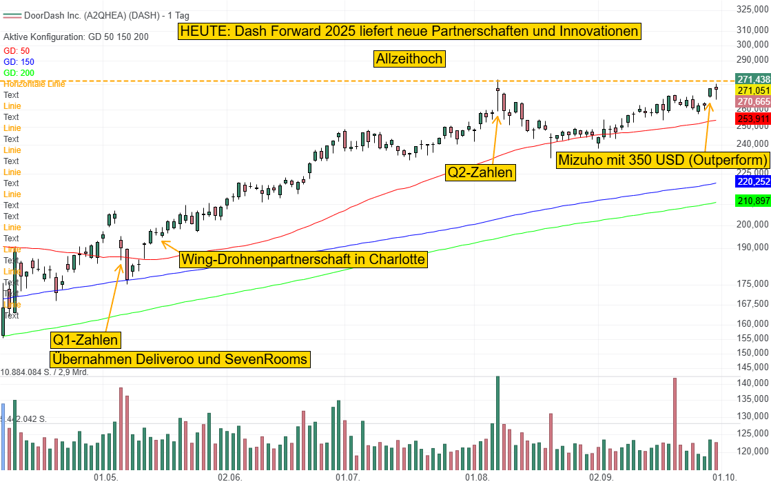 Evercore ISI rechnet weiterhin mit Wachstumsraten von 20 % und auch Mizuho rief am 29. September mit Verweis auf die erstklassige Erfolgsbilanz und das vom Gründer geführte Managementteam ein neues Kursziel von 350 USD (Outperform) aus. Auch das Werbegeschäft erreichte mit einer annualisierten Umsatzrate von 1 Mrd. USD einen neuen Meilenstein, den laut CEO Tony Xu in der Firmengeschichte kein anderer Bereich so schnell erreicht hat. Die Aktie notiert am Allzeithoch und könnte zeitnah einen Breakoutversuch starten.