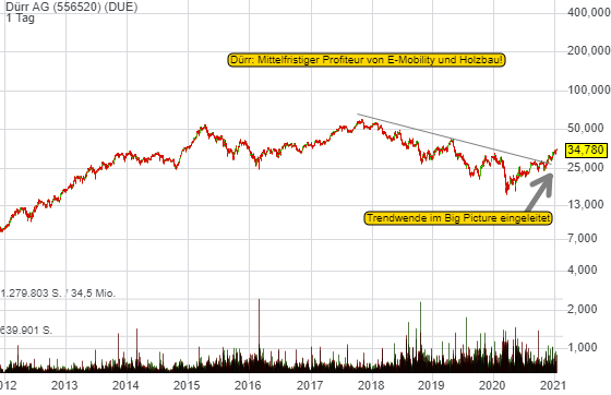 Die Zykliker sind am Markt favorisiert, weil die Akteure mit einem Ende der Lockdowns in Richtung Jahresmitte auf eine massiven konjunkturelle Erholung setzen. Die Aktie von DÜRR hat im Big Picture die Trendwende eingeleitet. Es gibt zwei Gründe, warum der Konzern auf mittelfristige Sicht positiv überraschen könnte.