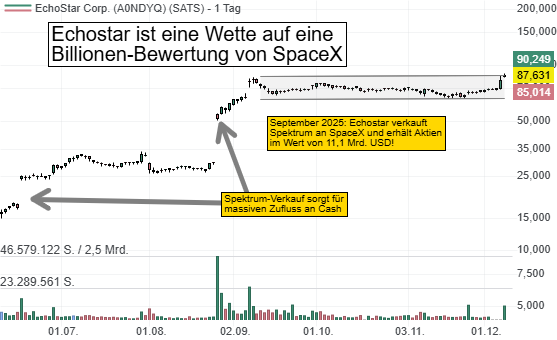 Ein Nutznießer der steigenden Bewertung sowie eines IPOs ist Echostar. Mit dieser Aktie kann auf SpaceX gesetzt werden. Warum? Durch den Verkauf des eigenen Spektrums an SpaceX erhielt man 11,1 Mrd. USD in SpaceX-Aktien. Wenn diese Aktien basierend auf einer Bewertung von 400 Mrd. USD abgegeben wurden, würde Echostar rund 2,75 % an SpaceX halten. Damit wäre die aktuelle Kapitalisierung von Echostar weitgehend durch den Wert der SpaceX-Aktien abgedeckt, insofern die Bewertung in Richtung 1 Bio. USD steigt. Ein IPO zu einer nochmals deutlich gesteigerten Bewertung würde der Echostar-Aktie-Auftrieb geben. Es ist derzeit das heißeste Asset, um auf einen Nachfrageboom nach SpaceX-Aktien sowie eine Billionen-Marktkapitalisierung im Zuge eines möglichen IPOs in 2026 zu wetten!