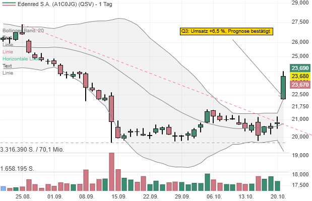 Am 21. Oktober hat der Konzern den Bericht für das 3. Quartal veröffentlicht. Der Gesamtumsatz von Edenred belief sich im 3. Quartal 2025 auf 726 Mio. Euro, was einem Anstieg von 7,3 % auf Like-for-like (LFL)-Basis und 6,5 % auf berichteter Basis gegenüber dem 3. Quartal 2024 entspricht. Positiv wirkte sich dabei u.a. die Expansion durch zahlreiche neue Kunden aus dem KMU-Segment aus, welche man im Ticket Restaurant-Angebot gewinnen konnte. Darüber hinaus trugen regulatorische Entscheidungen zur Erhöhung des maximalen Nennwerts von Essensgutscheinen in acht Ländern, in denen Edenred tätig ist, zur Steigerung bei, da Unternehmen die Kaufkraft ihrer Mitarbeiter besser unterstützen konnten. Die Differenz zwischen dem LFL-Wachstum und dem berichteten Wachstum ist auf einen positiven Scope-Effekt von 2,3 % (hauptsächlich durch Akquisitionen wie RB in Brasilien und das IP-Energiegeschäft in Italien) und einen ungünstigen Währungseffekt von -3,2 % (hauptsächlich aufgrund von Währungen in Lateinamerika) zurückzuführen. Der operative Umsatz (Operating revenue) stieg im 3. Quartal 2025 auf 667 Millionen Euro, was einer Beschleunigung des Wachstums auf 8,2 % LFL (7,8 % auf berichteter Basis) gegenüber dem Vorjahresquartal entspricht.