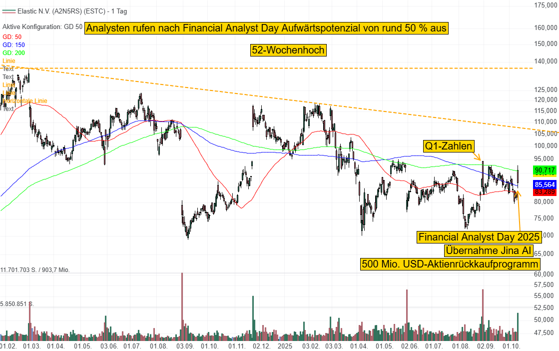 Generative KI soll das adressierbare Marktpotenzial von 143 Mrd. USD auf 296 Mrd. USD bis 2029 mehr als verdoppeln. Beim Financial Analyst Day am 9. Oktober hob das Management die mittelfristigen jährlichen Abonnementwachstumsziele auf über 20 % an, ebenso wie den Gesamtumsatz für das Fiskaljahr 2026 mit 1,69 bis 1,70 Mrd. USD (zuvor 1,68 bis 1,69 Mrd. USD). Rückenwind solle neue Funktionen wie Elastic Inference Service (EIS) als neuer Inferenz-as-a-Service-Lösung in der Elastic Cloud liefern. Auch die Übernahme von Jina AI sorgt dafür, dass das eigene KI-Modell "ELSER" für die semantische Suche künftig unstrukturierte Daten und mehrsprachige Dokumente in über 100 Sprachen gleichzeitig verarbeiten kann.