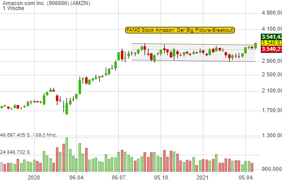 1.) Heute startet ein neuer bedeutsamer Chart-Breakout. Amazon löst sich aus einer seit Mitte 2020 anhaltenden Seitwärtsrange. Ein richtig bullisches Big Picture, wie der Weekly-Chart zeigt.