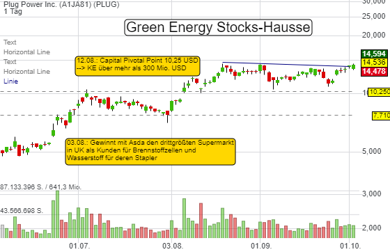 Der beste Anlagetrend am Markt sind die Green Energy Stocks. Wir spielen diesen. Eine Plug Power befindet sich seit 03.08.20 im US-Musterdepot. Gekauft wurde die Position zu 8,15 USD - Buchgewinn fast 80%. Jetzt sollte die Aktie auf ein neues 52-Wochenhoch ausbrechen!