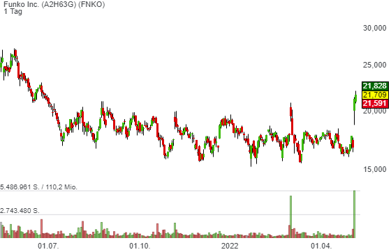 Sehr starke Dynamik ganz ohne News sehen wir heute bei der Aktie von Funko (FNKO). Der Konzern hat Ende der vergangenen Woche besser als erwartete Zahlen, inkl. positive News vorgelegt, wobei der Wert nun dem starken Impuls gegen den Markt zu folgen scheint.