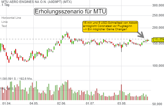Wenn der Schnelltest auch präventiv verwendet werden kann, ist das ein Game Changer. Reisende könnten vor dem Flug und während ihres Urlaubs regelmäßig günstig getestet werden. Das würde ein größeres Sicherheitsgefühl geben. Infolge könnten die Luftfahrt- und Hotelkapazitäten stärker ausgelastet werden. Es geht also darum mit dem Coronavirus zu leben, aber den Umgang zu erleichtern. Wenn durch einen präventiven Einsatz mehr geflogen wird, zieht das zivile Geschäft von MTU an. Airlines haben weniger Anreize ihre Aufträge zu stornieren. Es muss wieder mehr gewartet werden.