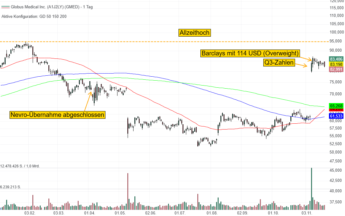 Die im April abgeschlossene Übernahme von Nevro wikt sich ein Jahr früher als geplant bereits 2025 positiv auf die Profitabilität aus und adressiert mit Neuromodulationstechnologien für die Behandlung chronischer Schmerzen eine Marktchance von 2,5 Mrd. USD. Nevro konnte sequenziell um 4,9 % auf 99,3 Mio. USD wachsen. Insgesamt konnte Globus Medical im 3. Quartal neue Rekorde beim Umsatz (+23 %), Nettogewinn (+42 %) und Free Cashflow verzeichnen. Für das Fiskaljahr 2025 hob das Management den Umsatzausblick von 2,80 bis 2,90 Mrd. auf 2,86 bis 2,90 Mrd. USD an. Ebenso soll der Nettogewinn statt 3,00 bis 3,30 USD mit 3,75 bis 3,85 USD je Aktie deutlich höher ausfallen.