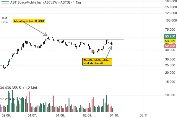 Die Aktie ist extrem volatil und hat in den letzten Wochen bullisch konsolidiert. Wenn der Ausbruch bei 56 USD gelingt, dürfte es schnell zu neuen Allzeithochs gehen. (ASTS)