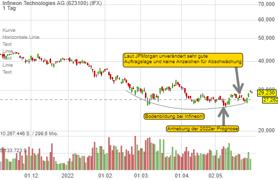 Die Aktie von Infineon verweigert sich seit März dem Brand der Technologie-Aktien. Ein Boden entstand. Mit einem Ausbruch über 30 Euro hellt sich das Chartbild auf. Was macht den Wert interessant?