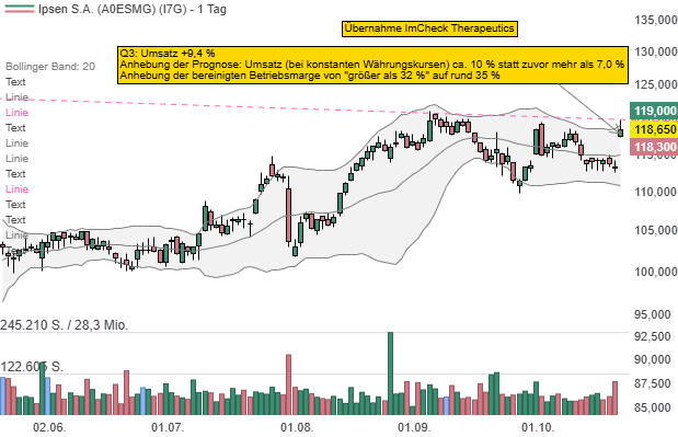 Zum anderen wurden der Bericht für die ersten neun Monate und die Anhebung der Prognose verkündet. Ipsen verzeichnete in den ersten neun Monaten des Jahres 2025 ein starkes Umsatzwachstum, das von allen drei Therapiebereichen getragen wurde. Positiv hat sich dabei im Bereich "Seltene Krankheiten" die starke Performance des Franchise für seltene Lebererkrankungen, insbesondere durch Bylvay, ausgezahlt. Im Bereich "Neurowissenschaften" wurde ein solides Wachstum verzeichnet und im Bereich der "Onkologie" wurde das Wachstum durch eine starke Performance von Iqirvo und Somatuline angetrieben. Das Wachstum im Onkologie-Bereich wird durch die langsamer als erwartete Erosion von Somatuline gestützt. Der Gesamtumsatz stieg dadurch in den ersten neun Monaten 2025 auf 2,7348 Mrd. Euro (Vorjahreszeitraum: 2,4959 Mrd. Euro). Dies entspricht einem Wachstum von 9,6 % (tatsächlich) bzw. 12,1 % bei konstanten Wechselkursen (KRK). Im 3. Quartal belief sich der Gesamtumsatz auf 915,0 Mio. Euro (Q3 2024: 836,6 Mio. Euro), was einem Wachstum von 9,4 % (tatsächlich) oder 13,7 % (KRK) entspricht.