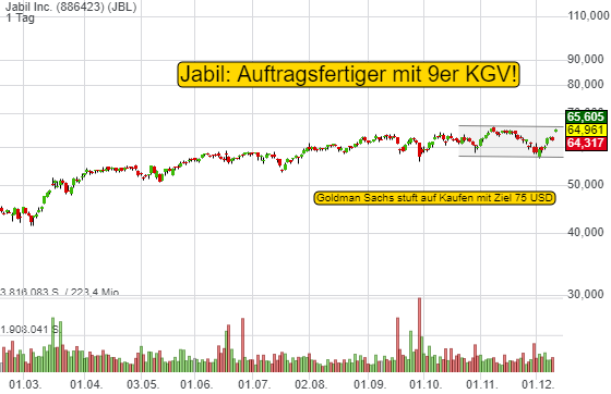 Der Auftragsfertiger Jabil (JBL) erhielt heute ein bedeutsames Buy-Rating von den Goldman Sachs-Analysten. Sie stuften von Neutral auf Kaufen. Das Ziel wurde von 63 USD auf 75 USD angehoben. Hintergrund ist, dass Wachstumsmärkte wie E-Autos und die Cloud einen immer wichtigen Umsatzanteil bei Jabil einnehmen. Daher sollte der Konzern auch in den nächsten Jahren sein Wachstum ausdehnen können. Das katapultiert die Aktie ans 52-Wochenhoch.