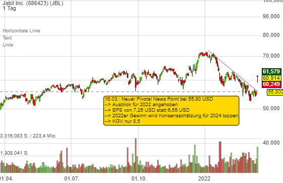 Die gestrigen Zahlen und der Ausblick auf 2022 waren exzellent. Jabil hat sein Quartalswachstum auf 11% beschleunigt. 5G, E-Autos, personalisierte Medizin, Smart Energy-Infrastruktur und Cloud Computing werden als Wachstumstreiber gesehen. Der Umsatz wird in diesem Jahr mehr als 10% auf 32,6 Mrd. USD zulegen. Die EPS-Prognose wurde von 6,55 USD auf 7,25 USD (+30%) angehoben - der Konsens hatte das nicht mal für 2024 auf der Rechnung. Damit beträgt das KGV22e lediglich 8,5. Für ein Unternehmen mit einem zweistelligen Wachstum, welches erfolgreich durch das Umfeld strapazierter Lieferketten manövriert, ist das viel zu günstig. Hinzu kommt, Jabil erzielt satte Free Cash Flows. Im Jahr 2022 wird er bei gut 700 Mio. USD liegen. Bei einer Kapitalisierung von 8,7 Mrd. USD ermöglicht das bedeutsame Aktienrückkäufe.