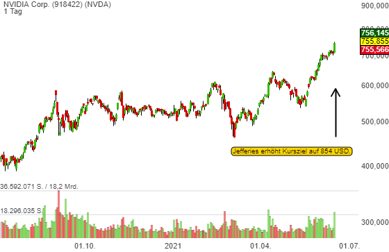 Jefferies hob das Kursziel für die Aktie des Chipherstellers Nvidia (NVDA) von 740 auf 854 USD. Laut Marketwatch und FactSet ist dies nun die höchste Bewertung des Unternehmens. Daher auch kein Wunder, dass der Wert auf ein neues Jahreshoch ausbracht und damit ein frisches Trendfolge-Long-Signal generierte.