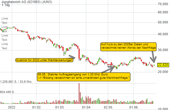 Jungheinrich spricht nun davon auf dem Kurs zu den Zielen im Jahr 2025 zu sein. Diese bedeuten einen Umsatz von 5,5 Mrd. Euro bei einer EBIT-Marge von 8-10 %. Unter dem Strich könnte der Konzern mehr als 3 Euro/Aktie erzielen. Das KGV wäre bei 7,5. Interessant ist, dass der Konzern mit dem Beginn des Ukraine-Kriegs keinen Abriss bei den Aufträgen verzeichnet, heißt es gegenüber der BöZ. Um das Ziel von 20% an außereuropäischem Umsatz bis 2025 zu erreichen, wären Übernahmen notwendig. In den USA schaut man auf die Bereiche Robotik, Automatik und Software. "Wir wollen uns noch mehr als in der Vergangenheit von unserem Wettbewerb differenzieren." Die positiven Aussagen vom Vorstand müssten bei der Aktie zu einer relativen Stärke führen, weshalb ich eine Trading-Position halte.