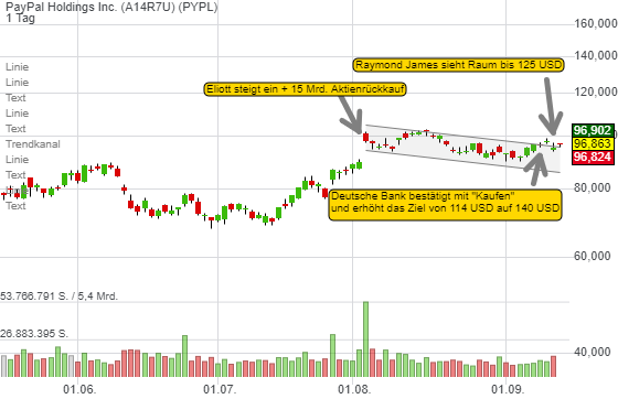 Die Aktie von Paypal hat sich in den letzten Wochen ganz gut gehalten. Der aktivistische Investor Elliott stieg ein. Zudem will man 15 Mrd. USD für Aktienrückkäufe aufwenden. Im Jahr 2022 werden davon rund 4 Mrd. USD aufgewendet.