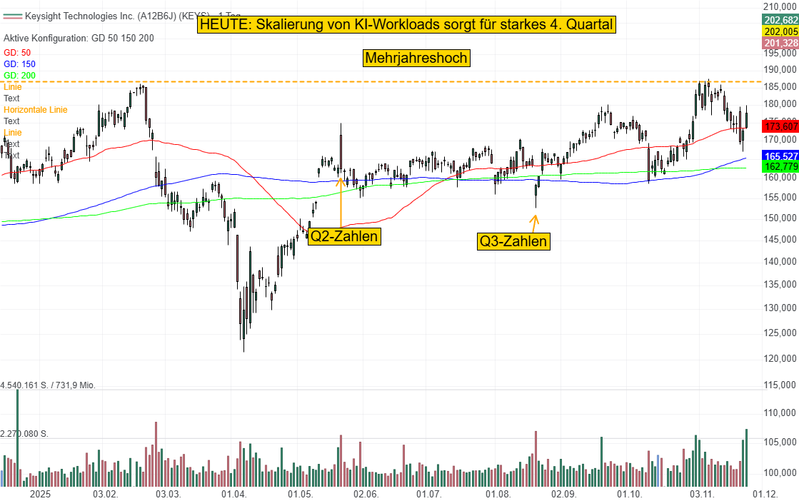 Keysight Technologies (KEYS) liefert führende Test- und Messgeräte, die Kunden eine rasche Markteinführung ermöglichen und sicherstellen, dass Geräte und Systeme zuverlässig funktionieren. Im 4. Quartal gab es neue Rekorde bei verkabelten Kommunikationslösungen für Netzwerke dank des raschen Ausbaus der KI-Infrastruktur und schnelleren Technologieupgrades. Auch die 6G-Kooperationen haben sich im letzten Jahr verdoppelt und es gab Rekordaufträge im Bereich Luft- und Raumfahrt, Verteidigung und Regierung. CEO Satish Dhanasekaran spricht von einer führenden Marktposition in bedienten Märkten mit hochdifferenzierten Produkten.