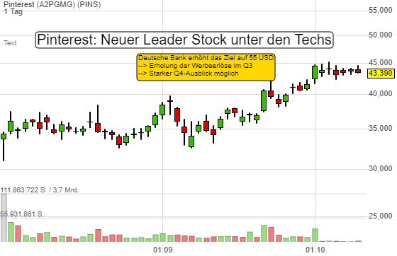 1.) Die Aktie sollte mit dem Wochenbeginn zum Ausbruch auf das 52-Wochenhoch ansetzen. Der Widerstand um 45 USD dürfte herausgenommen werden. Warum? Die Deutsche Bank erhöhte das Ziel von 43 USD auf 55 USD. Das wird den Fokus der Institutionellen auf Pinterest lenken.